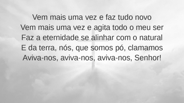 - Vem mais uma vez e faz tudo novoVem mais uma vez e agita todo o meu serFaz a eternidade se alinhar com o naturalE da terra, nós, que somos pó, clamamosAviva-nos, aviva-nos, aviva-nos, Senhor!