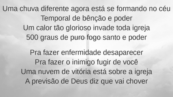 - Uma chuva diferente agora está se formando no céuTemporal de bênção e poderUm calor tão glorioso invade toda igreja500 graus de puro fogo santo e poderPra fazer enfermidade desaparecerPra fazer o inimigo fugir de vocêUma nuvem de vitória está sobre a igrejaA previsão de Deus diz que vai chover
