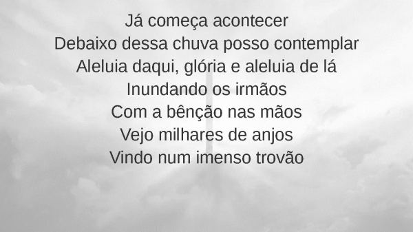 - Já começa acontecerDebaixo dessa chuva posso contemplarAleluia daqui, glória e aleluia de láInundando os irmãosCom a bênção nas mãosVejo milhares de anjosVindo num imenso trovão