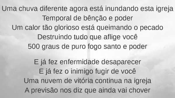 - Uma chuva diferente agora está inundando esta igrejaTemporal de bênção e poderUm calor tão glorioso está queimando o pecadoDestruindo tudo que aflige você500 graus de puro fogo santo e poderE já fez enfermidade desaparecerE já fez o inimigo fugir de vocêUma nuvem de vitória continua na igrejaA previsão nos diz que ainda vai chover