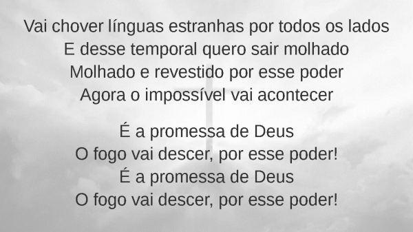 - Vai chover línguas estranhas por todos os ladosE desse temporal quero sair molhadoMolhado e revestido por esse poderAgora o impossível vai acontecerÉ a promessa de DeusO fogo vai descer, por esse poder!É a promessa de DeusO fogo vai descer, por esse poder!