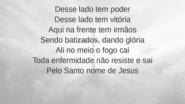 - Desse lado tem poderDesse lado tem vitóriaAqui na frente tem irmãosSendo batizados, dando glóriaAli no meio o fogo caiToda enfermidade não resiste e saiPelo Santo nome de Jesus