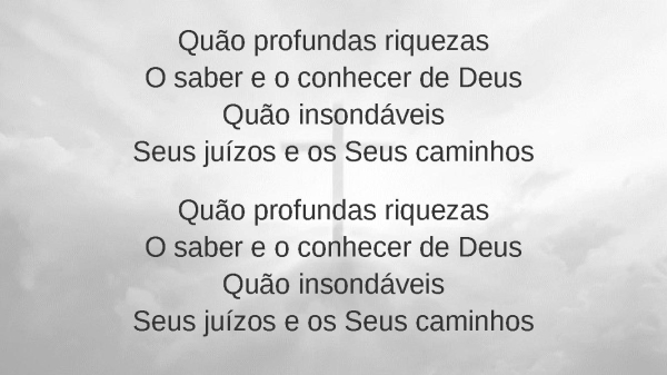 - Quão profundas riquezasO saber e o conhecer de DeusQuão insondáveisSeus juízos e os Seus caminhosQuão profundas riquezasO saber e o conhecer de DeusQuão insondáveisSeus juízos e os Seus caminhos
