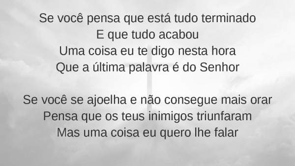 - Se você pensa que está tudo terminadoE que tudo acabouUma coisa eu te digo nesta horaQue a última palavra é do SenhorSe você se ajoelha e não consegue mais orarPensa que os teus inimigos triunfaramMas uma coisa eu quero lhe falar