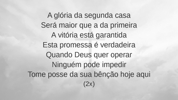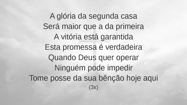 - A glória da segunda casaSerá maior que a da primeiraA vitória está garantidaEsta promessa é verdadeiraQuando Deus quer operarNinguém pode impedirTome posse da sua bênção hoje aqui(2x)