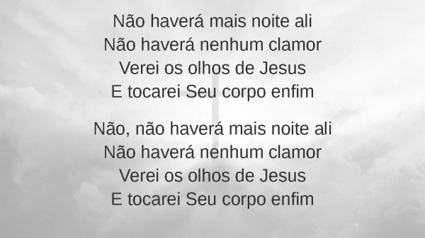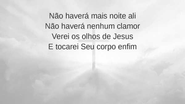 - Não haverá mais noite aliNão haverá nenhum clamorVerei os olhos de JesusE tocarei Seu corpo enfim