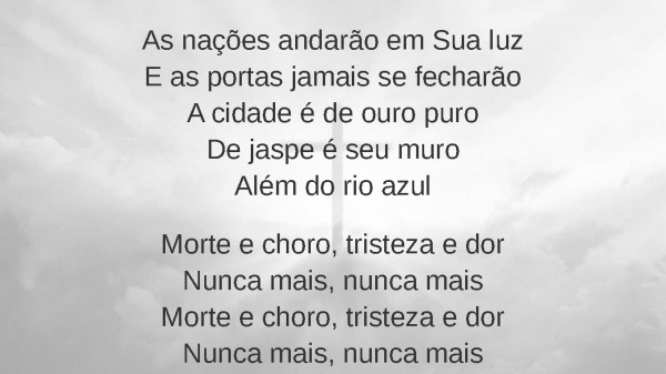 - As nações andarão em Sua luzE as portas jamais se fecharãoA cidade é de ouro puroDe jaspe é seu muroAlém do rio azulMorte e choro, tristeza e dorNunca mais, nunca maisMorte e choro, tristeza e dorNunca mais, nunca mais