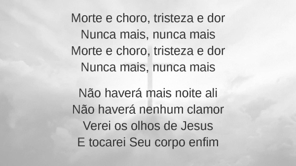 - Morte e choro, tristeza e dorNunca mais, nunca maisMorte e choro, tristeza e dorNunca mais, nunca maisNão haverá mais noite aliNão haverá nenhum clamorVerei os olhos de JesusE tocarei Seu corpo enfim