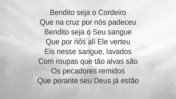 - Bendito seja o CordeiroQue na cruz por nós padeceuBendito seja o Seu sangueQue por nós ali Ele verteuEis nesse sangue, lavadosCom roupas que tão alvas sãoOs pecadores remidosQue perante seu Deus já estão