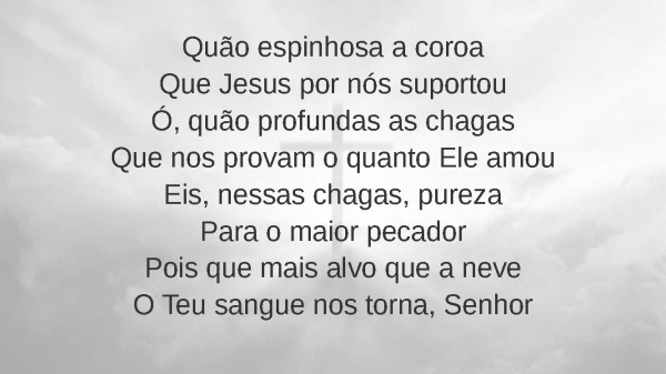 - Quão espinhosa a coroaQue Jesus por nós suportouÓ, quão profundas as chagasQue nos provam o quanto Ele amouEis, nessas chagas, purezaPara o maior pecadorPois que mais alvo que a neveO Teu sangue nos torna, Senhor