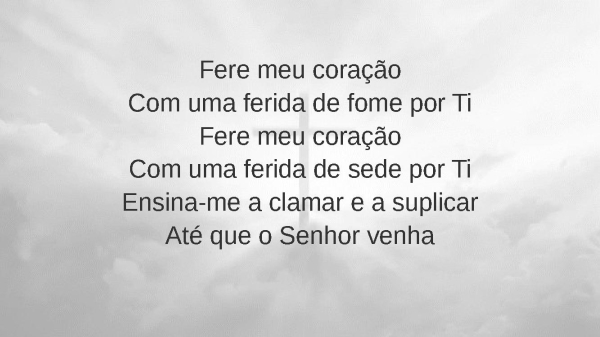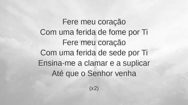 - Fere meu coraçãoCom uma ferida de fome por TiFere meu coraçãoCom uma ferida de sede por TiEnsina-me a clamar e a suplicarAté que o Senhor venha(x2)