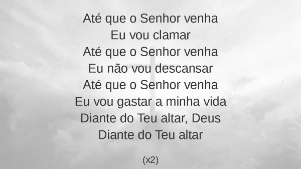- Até que o Senhor venhaEu vou clamarAté que o Senhor venhaEu não vou descansarAté que o Senhor venhaEu vou gastar a minha vidaDiante do Teu altar, DeusDiante do Teu altar(x2)