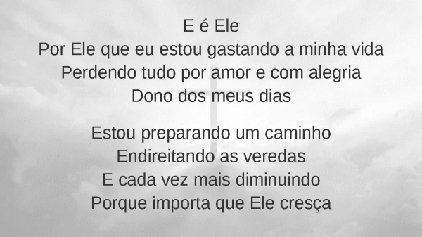 - E é ElePor Ele que eu estou gastando a minha vidaPerdendo tudo por amor e com alegriaDono dos meus diasEstou preparando um caminhoEndireitando as veredasE cada vez mais diminuindoPorque importa que Ele cresça