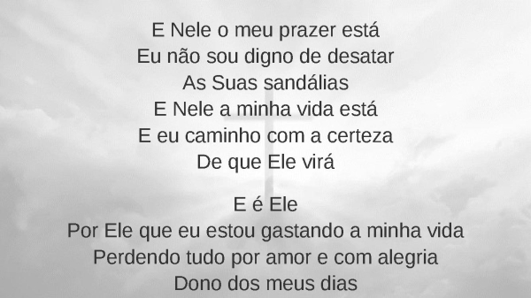 - E Nele o meu prazer estáEu não sou digno de desatarAs Suas sandáliasE Nele a minha vida estáE eu caminho com a certezaDe que Ele viráE é ElePor Ele que eu estou gastando a minha vidaPerdendo tudo por amor e com alegriaDono dos meus dias