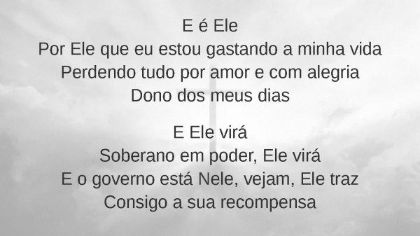 - E é ElePor Ele que eu estou gastando a minha vidaPerdendo tudo por amor e com alegriaDono dos meus diasE Ele viráSoberano em poder, Ele viráE o governo está Nele, vejam, Ele trazConsigo a sua recompensa