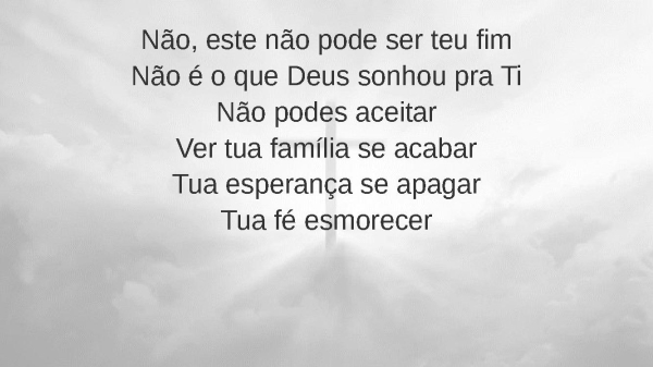 - Não, este não pode ser teu fimNão é o que Deus sonhou pra TiNão podes aceitarVer tua família se acabarTua esperança se apagarTua fé esmorecer