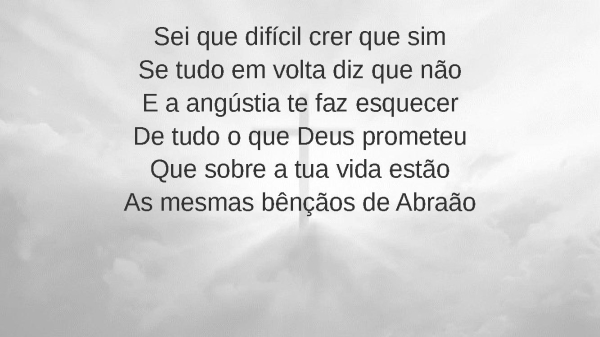 - Sei que difícil crer que simSe tudo em volta diz que nãoE a angústia te faz esquecerDe tudo o que Deus prometeuQue sobre a tua vida estãoAs mesmas bênçãos de Abraão