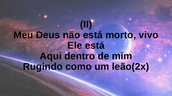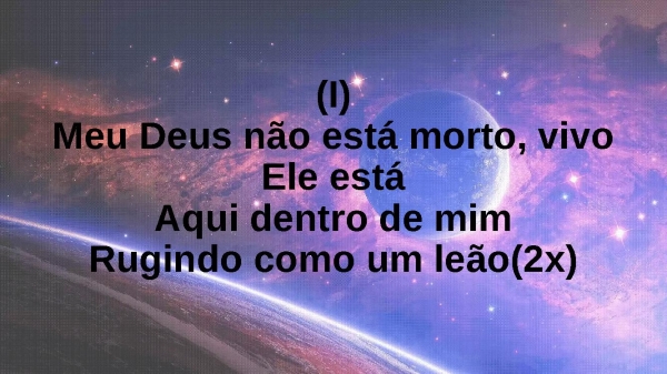 - (I)Meu Deus não está morto, vivo Ele estáAqui dentro de mimRugindo como um leão(2x)