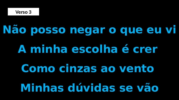 - Não posso negar o que eu viA minha escolha é crer Como cinzas ao vento Minhas dúvidas se vãoVerso 3