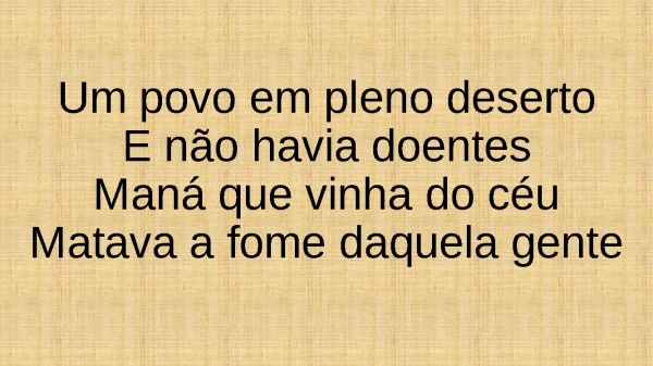 - Um povo em pleno desertoE não havia doentesManá que vinha do céuMatava a fome daquela gente