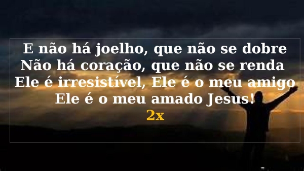 - E não há joelho, que não se dobreNão há coração, que não se renda Ele é irresistível, Ele é o meu amigoEle é o meu amado Jesus!2x
