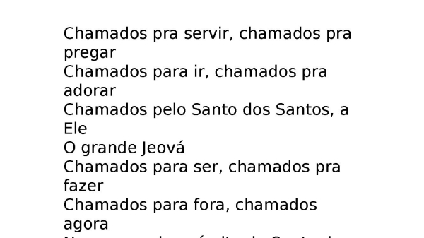 - Chamados pra servir, chamados pra pregarChamados para ir, chamados pra adorarChamados pelo Santo dos santos, a EleO grande Jeová (glória)Chamados para ser, chamados pra fazerChamados para fora, chamados agoraNesse grande exército do Santo dos santosVou servir a Jeová (Ô Deus)