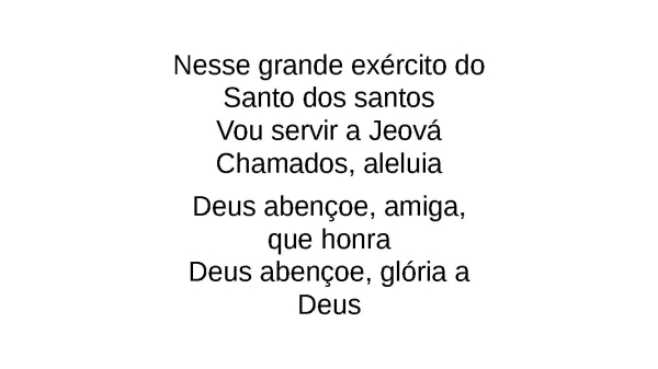 - Nesse grande exército do Santo dos santosVou servir a JeováChamados, aleluiaDeus abençoe, amiga, que honraDeus abençoe, glória a Deus