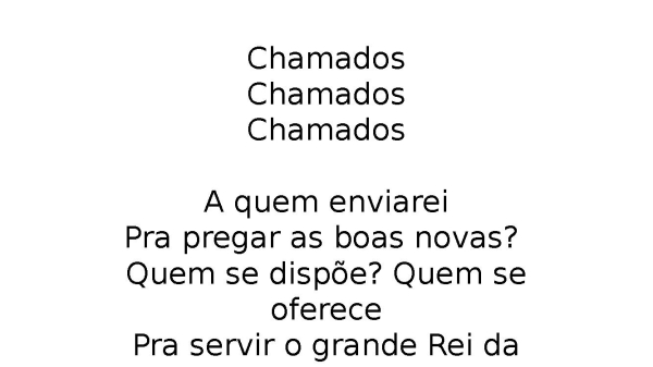 - ChamadosChamadosChamadosA quem enviareiPra pregar as boas novas? Quem se dispõe? Quem se oferecePra servir o grande Rei da Glória?