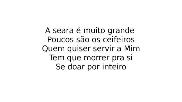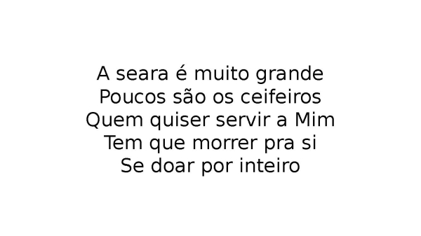 - A seara é muito grande Poucos são os ceifeirosQuem quiser servir a MimTem que morrer pra siSe doar por inteiro