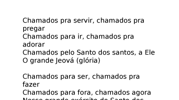 - Chamados pra servir, chamados pra pregarChamados para ir, chamados pra adorarChamados pelo Santo dos Santos, a EleO grande JeováChamados para ser, chamados pra fazerChamados para fora, chamados agoraNesse grande exército do Santo dos santosVou servir a Jeová