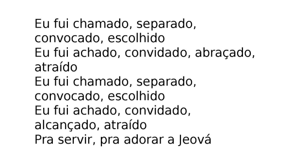 - Eu fui chamado, separado, convocado, escolhidoEu fui achado, convidado, abraçado, atraídoEu fui chamado, separado, convocado, escolhidoEu fui achado, convidado, alcançado, atraídoPra servir, pra adorar a Jeová