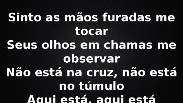 - Sinto as mãos furadas me tocarSeus olhos em chamas me observarNão está na cruz, não está no túmuloAqui está, aqui está