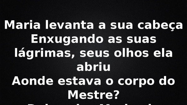 - Maria levanta a sua cabeçaEnxugando as suas lágrimas, seus olhos ela abriuAonde estava o corpo do Mestre?Dois anjos Maria viu