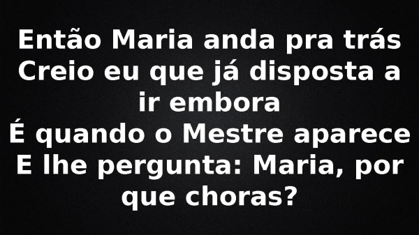 - Então Maria anda pra trásCreio eu que já disposta a ir emboraÉ quando o Mestre apareceE lhe pergunta: Maria, por que choras?