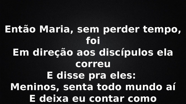 - Então Maria, sem perder tempo, foiEm direção aos discípulos ela correuE disse pra eles: Meninos, senta todo mundo aíE deixa eu contar como aconteceu