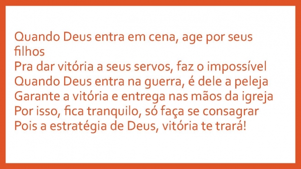 - Quando Deus entra em cena, age por seus filhosPra dar vitória a seus servos, faz o impossívelQuando Deus entra na guerra, é dele a pelejaGarante a vitória e entrega nas mãos da igrejaPor isso, fica tranquilo, só faça se consagrarPois a estratégia de Deus, vitória te trará!