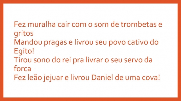- Fez muralha cair com o som de trombetas e gritosMandou pragas e livrou seu povo cativo do Egito!Tirou sono do rei pra livrar o seu servo da forcaFez leão jejuar e livrou Daniel de uma cova!