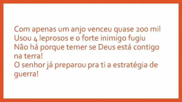 - Com apenas um anjo venceu quase 200 milUsou 4 leprosos e o forte inimigo fugiuNão há porque temer se Deus está contigo na terra!O senhor já preparou pra ti a estratégia de guerra!