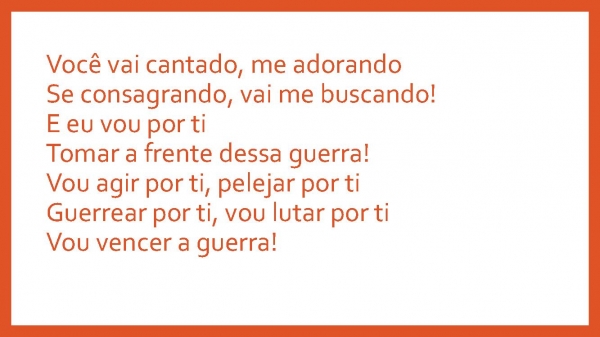 - Você vai cantado, me adorandoSe consagrando, vai me buscando!E eu vou por tiTomar a frente dessa guerra!Vou agir por ti, pelejar por tiGuerrear por ti, vou lutar por tiVou vencer a guerra!