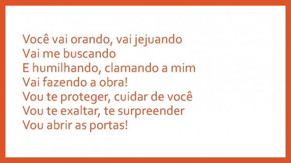 - Você vai orando, vai jejuandoVai me buscandoE humilhando, clamando a mimVai fazendo a obra!Vou te proteger, cuidar de vocêVou te exaltar, te surpreenderVou abrir as portas!