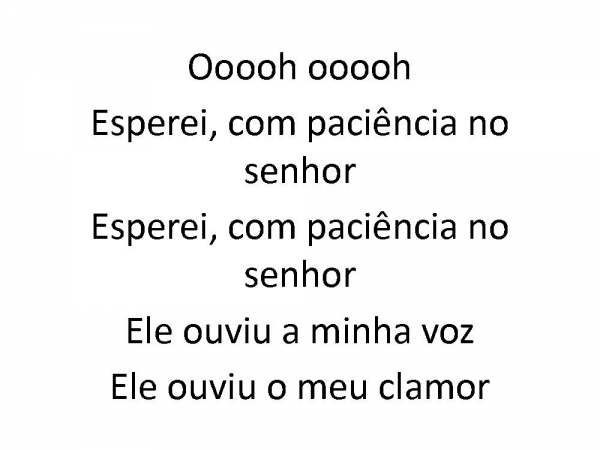 - Ooooh oooohEsperei, com paciência no senhorEsperei, com paciência no senhorEle ouviu a minha vozEle ouviu o meu clamor