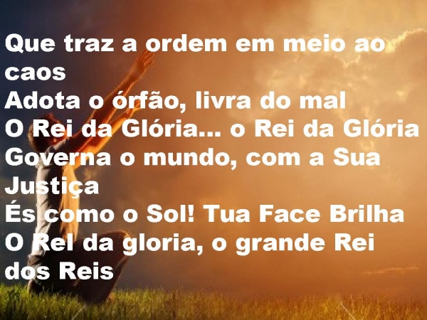- Que traz a ordem em meio ao caosAdota o órfão, livra do malO Rei da Glória... o Rei da GlóriaGoverna o mundo, com a Sua JustiçaÉs como o Sol! Tua Face BrilhaO ReI da gloria, o grande Rei dos Reis