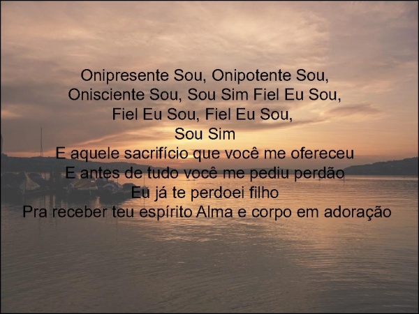 - Onipresente Sou, Onipotente Sou, Onisciente Sou, Sou Sim Fiel Eu Sou, Fiel Eu Sou, Fiel Eu Sou, Sou SimE aquele sacrifício que você me ofereceuE antes de tudo você me pediu perdãoEu já te perdoei filho Pra receber teu espírito Alma e corpo em adoração