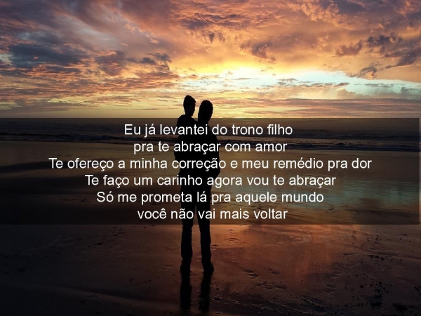 - Eu já levantei do trono filho pra te abraçar com amorTe ofereço a minha correção e meu remédio pra dorTe faço um carinho agora vou te abraçarSó me prometa lá pra aquele mundo você não vai mais voltar