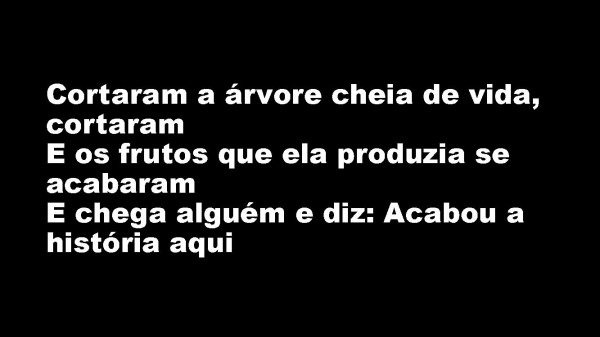 - Cortaram a árvore cheia de vida, cortaramE os frutos que ela produzia se acabaramE chega alguém e diz: Acabou a história aqui