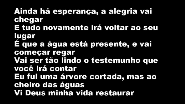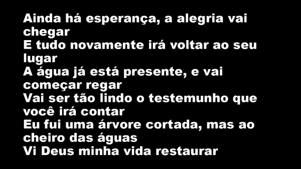 - Ainda há esperança, a alegria vai chegarE tudo novamente irá voltar ao seu lugarA água já está presente, e vai começar regarVai ser tão lindo o testemunho que você irá contarEu fui uma árvore cortada, mas ao cheiro das águasVi Deus minha vida restaurar