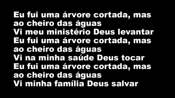 - Eu fui uma árvore cortada, mas ao cheiro das águasVi meu ministério Deus levantarEu fui uma árvore cortada, mas ao cheiro das águasVi na minha saúde Deus tocarEu fui uma árvore cortada, mas ao cheiro das águasVi minha família Deus salvar