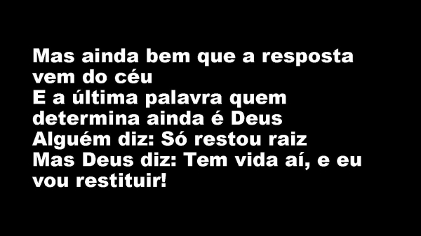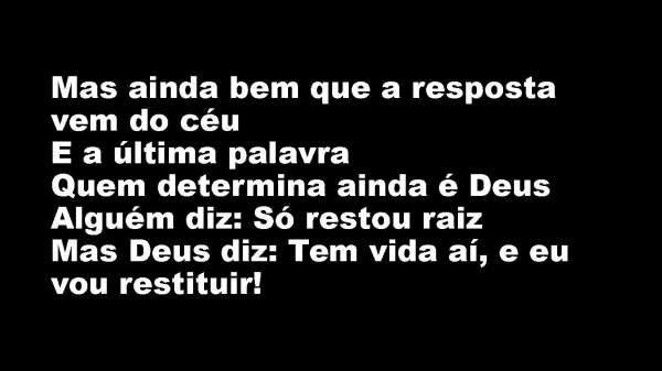 - Mas ainda bem que a resposta vem do céuE a última palavra quem determina ainda é DeusAlguém diz: Só restou raizMas Deus diz: Tem vida aí, e eu vou restituir!