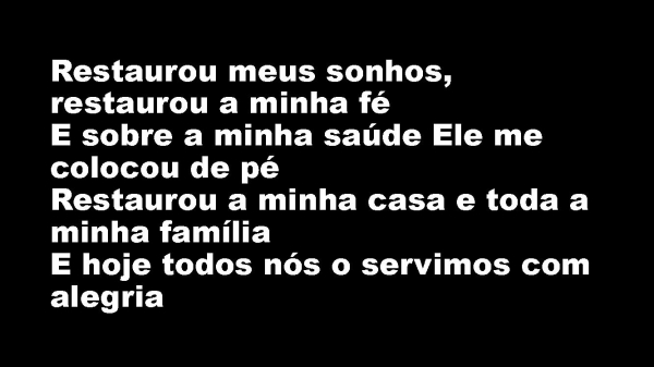 - Restaurou meus sonhos, restaurou a minha féE sobre a minha saúde Ele me colocou de péRestaurou a minha casa e toda a minha famíliaE hoje todos nós o servimos com alegria