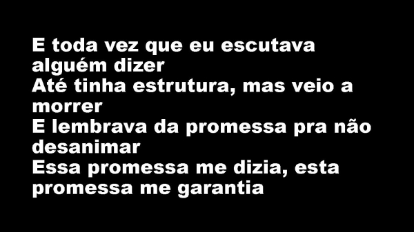 - E toda vez que eu escutava alguém dizerAté tinha estrutura, mas veio a morrerE lembrava da promessa pra não desanimarEssa promessa me dizia, esta promessa me garantia